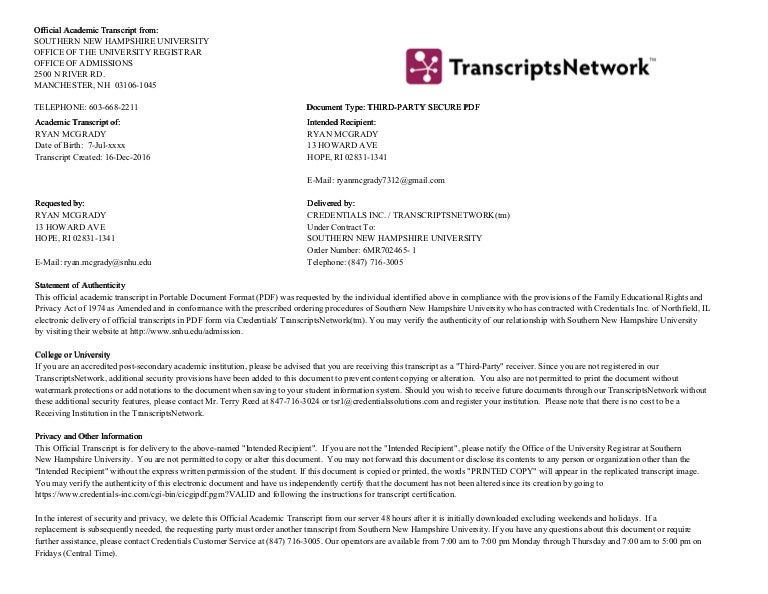 Ryan Mcgrady Transcripts Snhu 6mr7024651