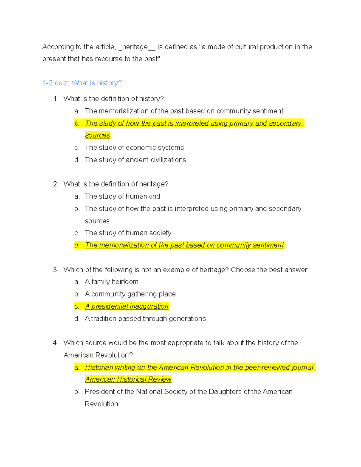 His100 Quizes Week 1 3 According To The Article Heritage Is Defined As Quot A Mode Of Studocu